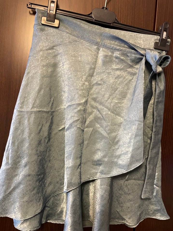Gri parlak , mini etek ve dökümlü ipeksi kumaşıyla bohem tarzda. Yanında bağlama detayı bulunur, günlük kullanım için uygundur.