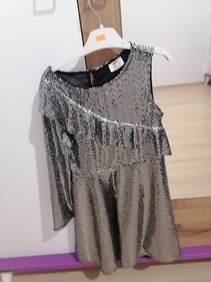 Kolsuz, bol kesim kız elbisesi, gri yılan baskısı ve fırfır detayıyla. Palet kumaş. Özel günler için ideal