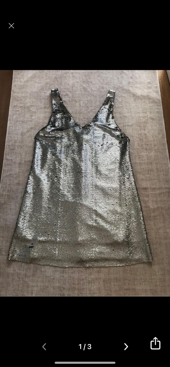Kolsuz, gri renkli, payetli ve yılan desenli parlak midi elbise, rahat bol kesim ile parti için uygun.
