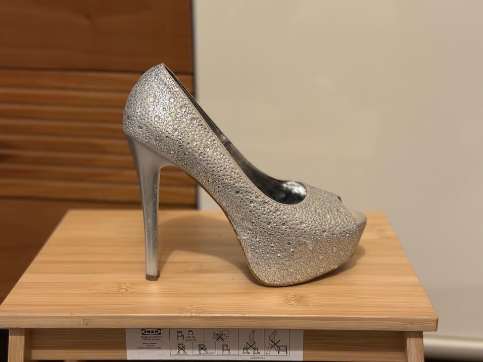 Parlak gri platform topuklu kadın abiye ayakkabı, metal malzeme üzerine pul detayları ve yılan deseniyle düğünler için uygundur. ✨. Özel günlerde birkaç kere giyilmiştir giyilmeye bağlı olarak ön parmak kısımlarında renk değişimi mevcut, kullanıma engel bir durum değildir, özel günlerinizde rahat kullanabilirsiniz