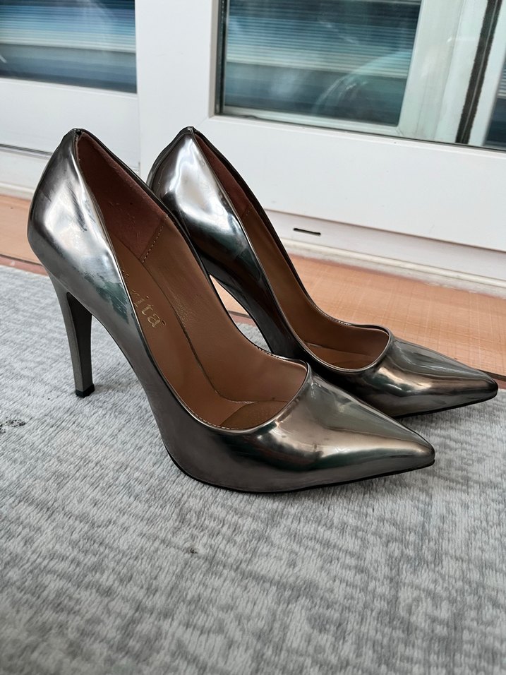 Parlak gri stiletto, metal malzeme ve sivri burunlu, şık topuklu ayakkabı. Fotoğrafta bellirtiğim yerde deforme olmuş ayakta belli olmuyor iki defa giydim