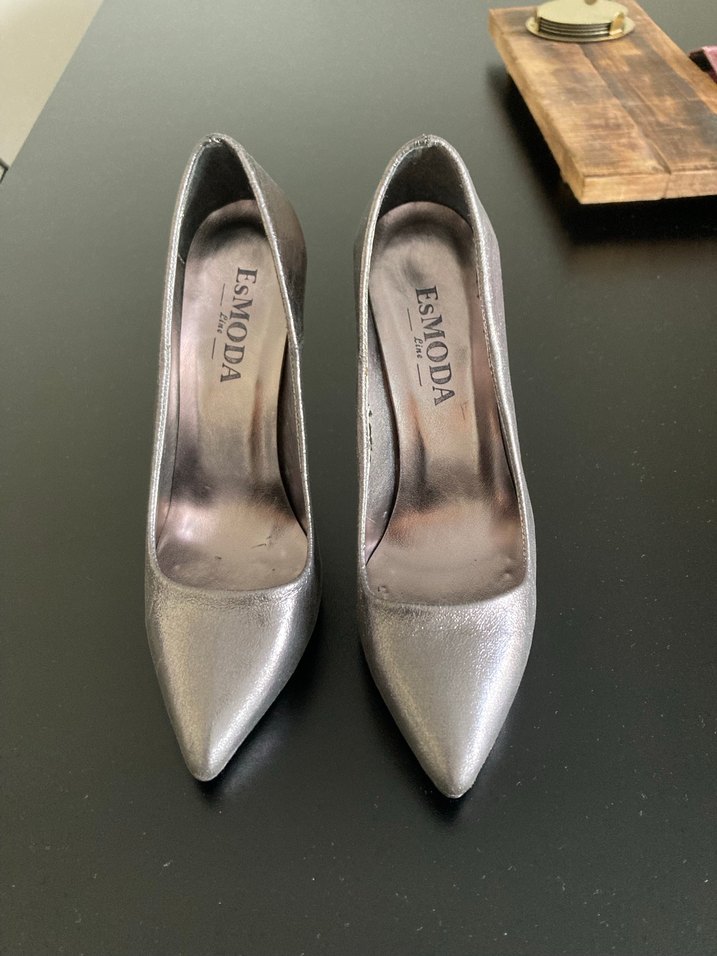 EsMODA imzalı, metal malzemeden yapılmış, gri parlak stiletto topuklu kadın ayakkabısı. Modern klasik tarzıyla düğün ve özel günlere uygundur. Sadece kınamda giyindim temiz kullanılmıştır hiçbir defosu yoktur. Topuk boyu: 12cm