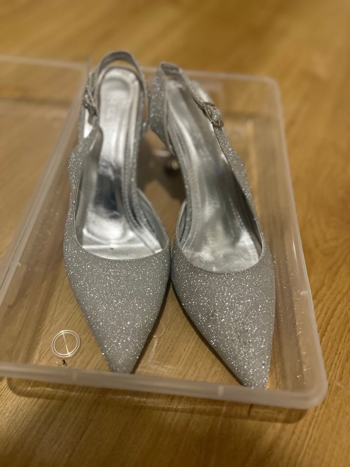 Gri renkli, stiletto topuklu abiye ayakkabı. Parlak simlerle süslenmiş, metal detaylı ve çağdaş bir tasarıma sahip. Düğün için uygun.