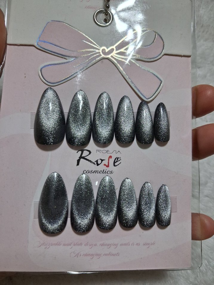 Rose cosmetics markalı, farklı boylarda gri parlak takma tırnak seti. Pürüzsüz yüzeyli ve kolay uygulanabilir.