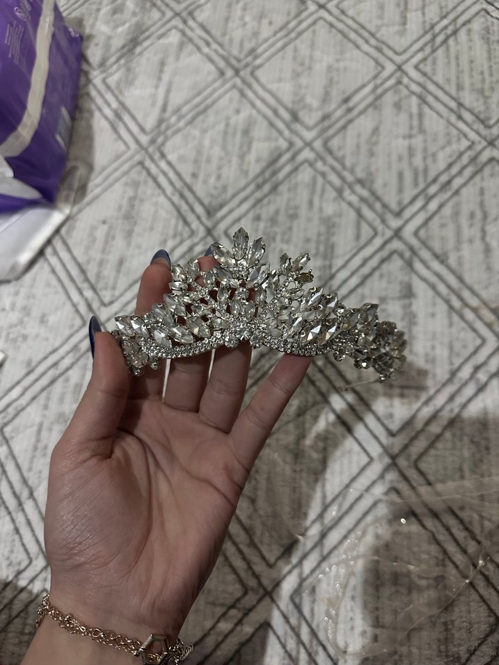 Gri renkli ve parlak taşlarla süslenmiş bu düğün tacı, klasik ve göz alıcı bir görünüm sunar.