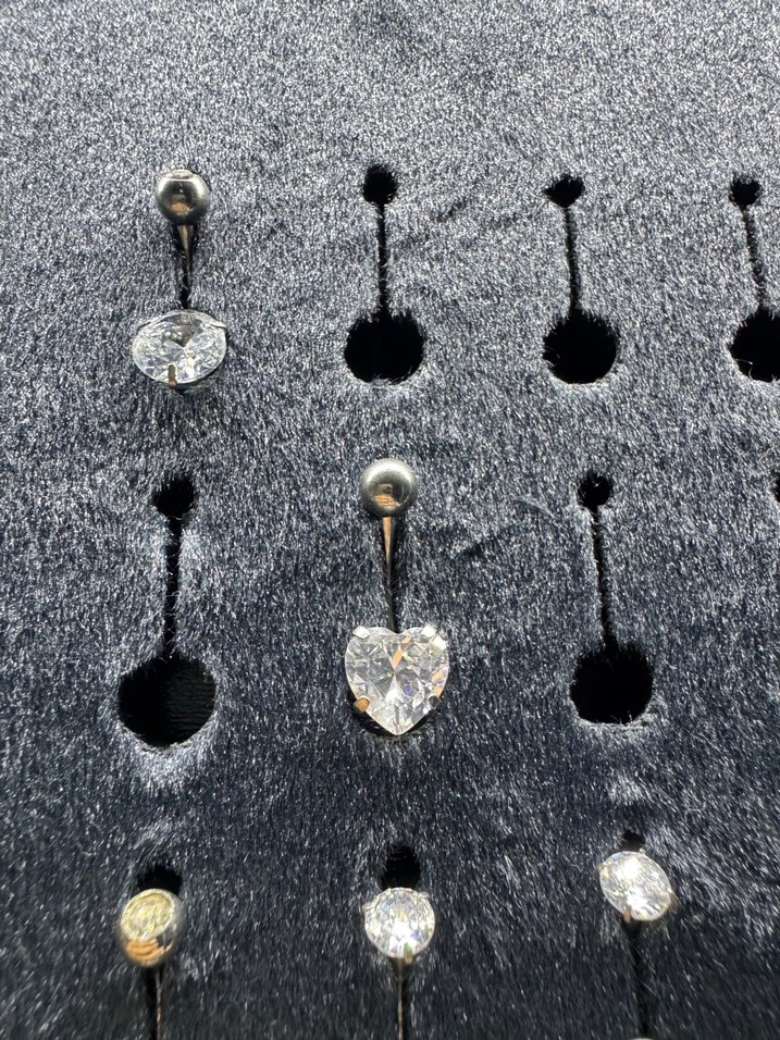 Gri renkte, yuvarlak ve kalp şeklinde parlak taşlara sahip Cerrahi çeliktir.