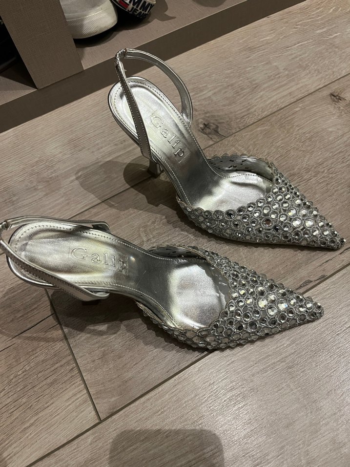 Gri Parlak Taşlı İnce Topuklu Abiye Ayakkabı