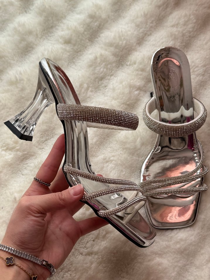 Gri Parlak Taşlı İnce Topuklu Kadın Abiye Ayakkabı