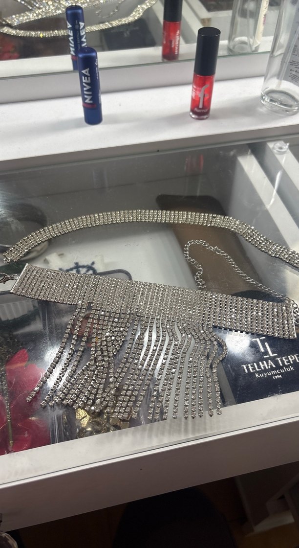 Gri renginde, payetli ve yılan desenli kadın vücut zinciri. Parti için uygun, çağdaş ve iddialı tasarımıyla trend belirleyicilere hitap eder. ✨ Choker ya da halhal İkili satıyorum