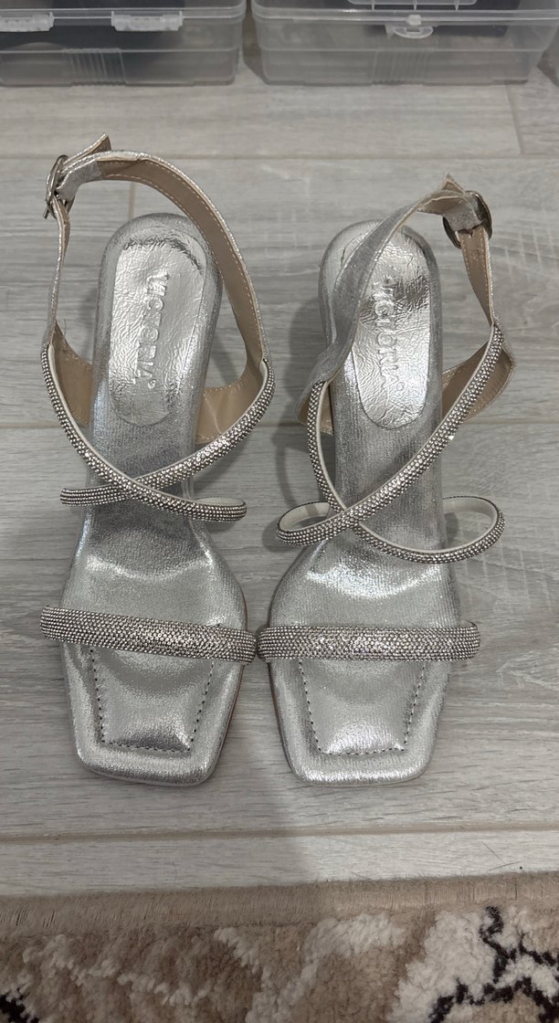 Gri parlak taşlı, metal dolgulu topuklu, tokalı kadın ayakkabısı. Klasik zarafete uygun, düğün için ideal şık tasarım.