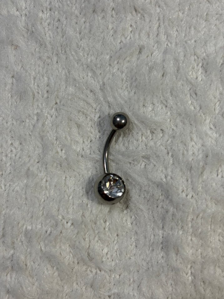 Minimalist tarzda, parlak taşlı gri göbek piercingi. Sade rock punk stilini yansıtır.