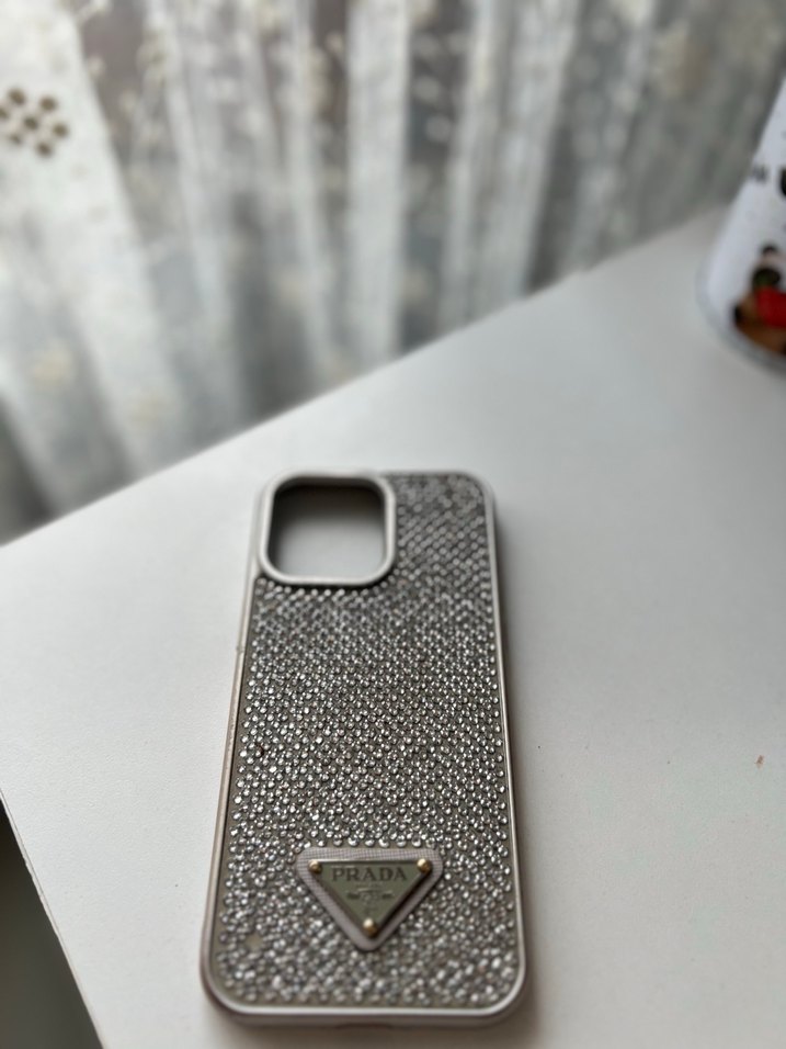 Gri renkli Prada telefon kılıfı, taşlı yüzeyi ve streetwear tarzıyla cihazınıza parlaklık katıyor.