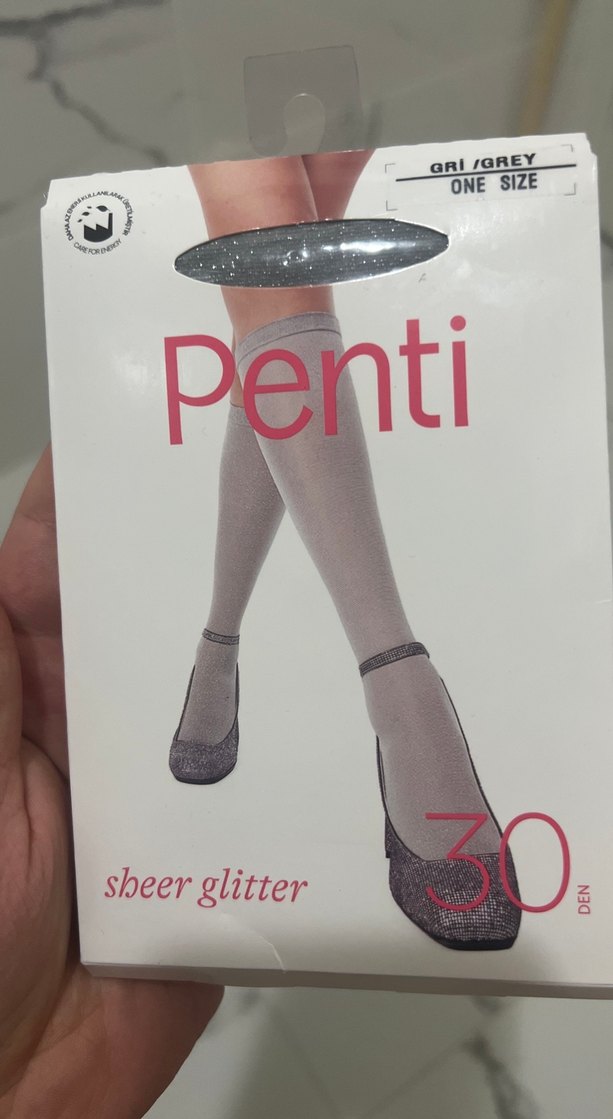 Penti markalı, tek beden, gri şeffaf parlak çorap. Orta boy, vücuda oturan kesimle zarif bir ışıltı sunar. ✨