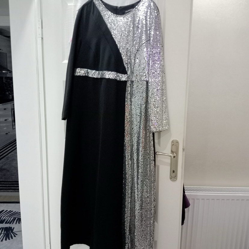 Uzun, bol kesim kadın abiye elbise, drapeli ve desenli parlak gri kumaştan. Uzun kollu ve yuvarlak yakalı, parti için uygun. ✨ 44/52 beden arası olur