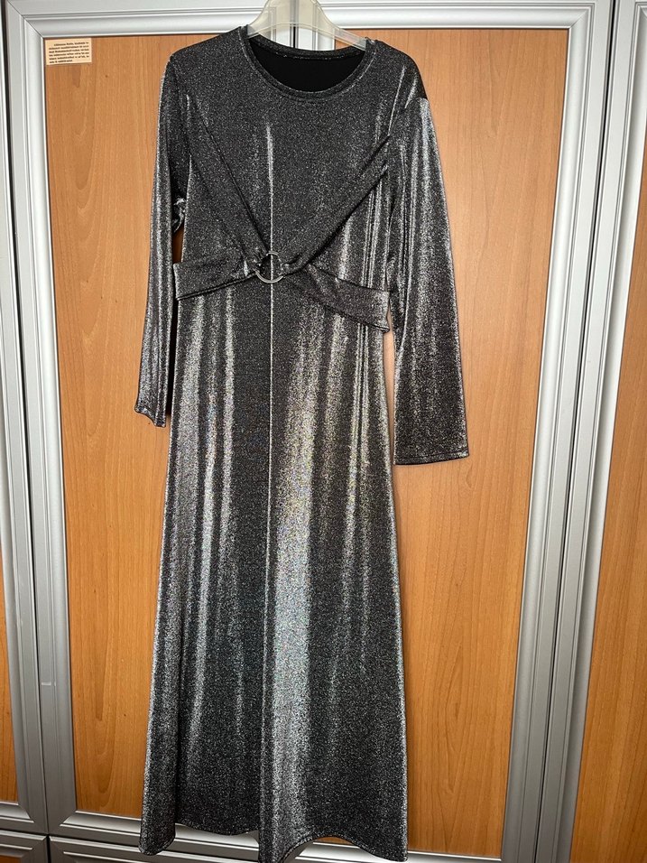 Tesettür abiye Parlak metalik gri kumaştan, kemerli ve uzun elbisedir. Tasarım elbise ✨