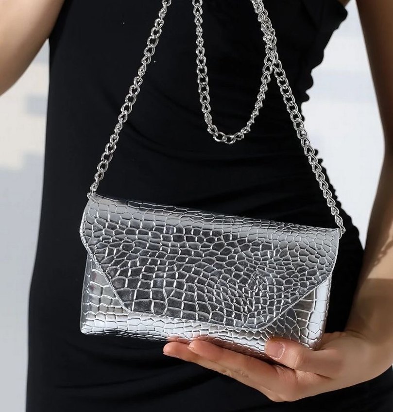 Gri parlak deri yüzey, yılan derisi desenli ve zincir detaylı bu kadın çantası, günlük kullanım için sokak stiliyle uyumludur.