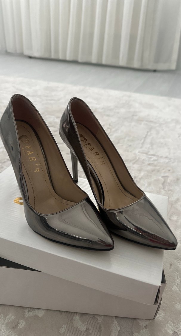 Gri parlak yılan desenli stiletto, kauçuk malzemeden ve klasik modern tasarıma sahip, ofis kullanımı için uygun.