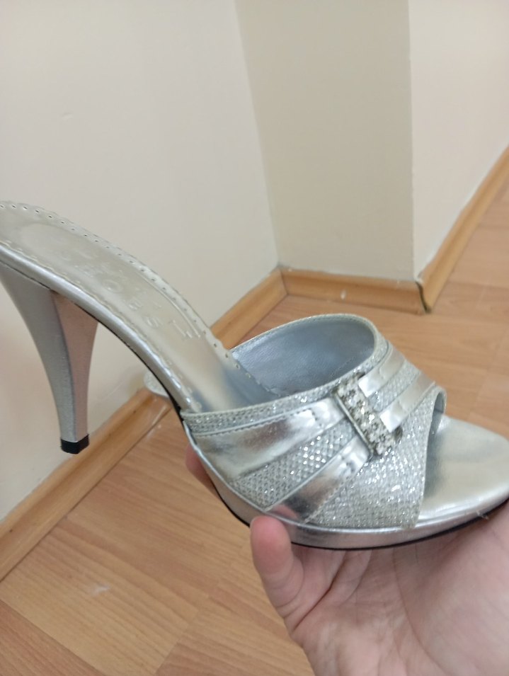 Gri parlak yılan desenli, tokalı ve ince topuklu kadın abiye ayakkabı. Düğünler için modern klasik ve gösterişli bir tasarım.