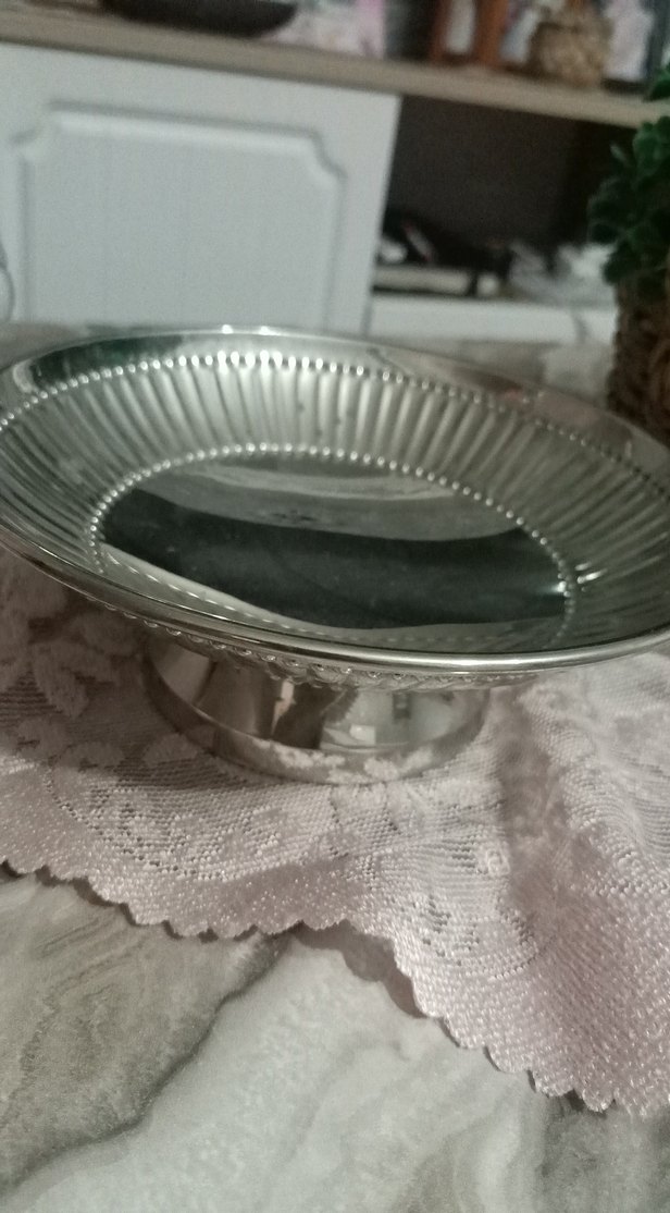 Parlak gri renkte, desen içermeyen yuvarlak ayaklı tabak, klasik ve sade tasarıma sahiptir. ️