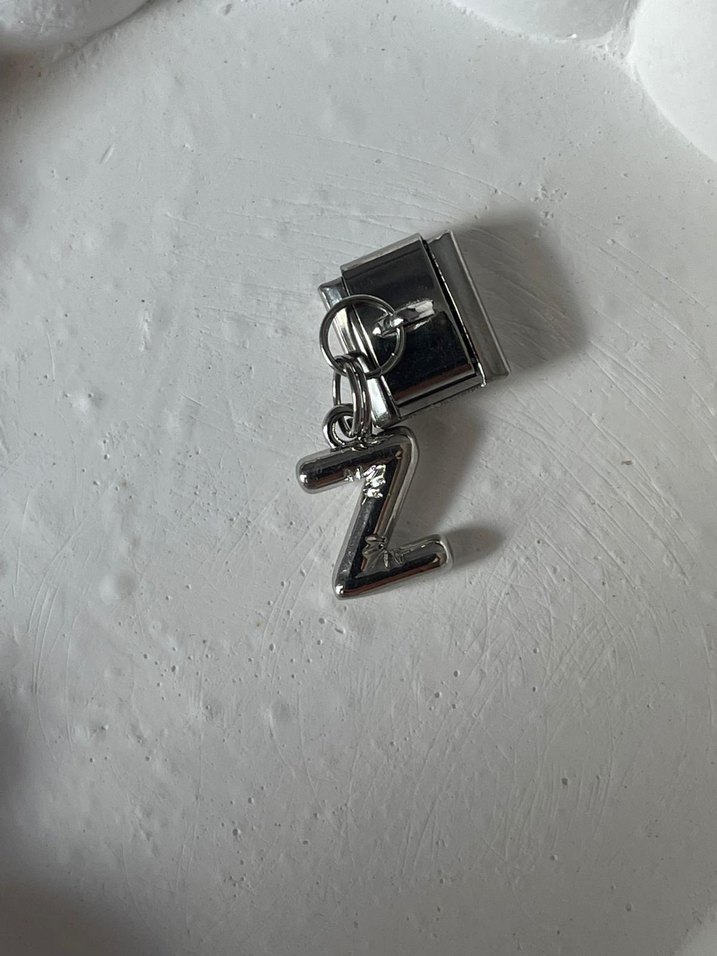 Gri parlak renkte, fermuarlı ve Z harfi baskılı kadın charm. Minimalist ve sade tarzda, günlük kullanıma uygun. ✨