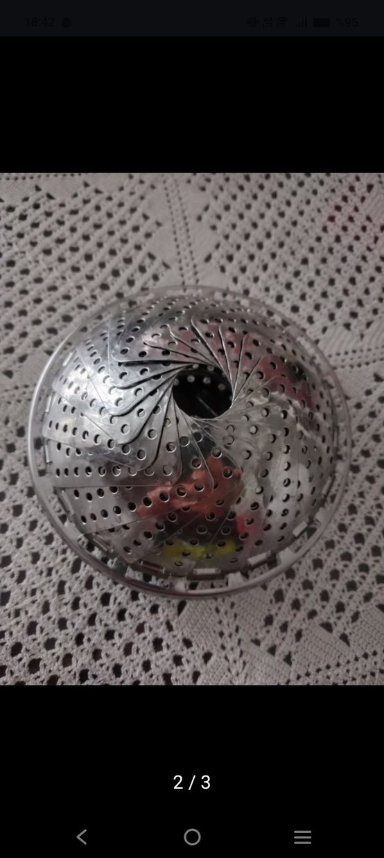 Gri paslanmaz çelikten yapılmış, delikli tasarımlı bebek sebze pişirme aparati.