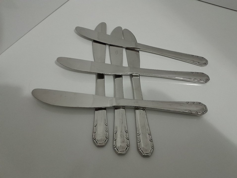 Çeşitli yemek ihtiyaçlarına uygun, dekoratif saplı gri paslanmaz çelik bıçak seti.