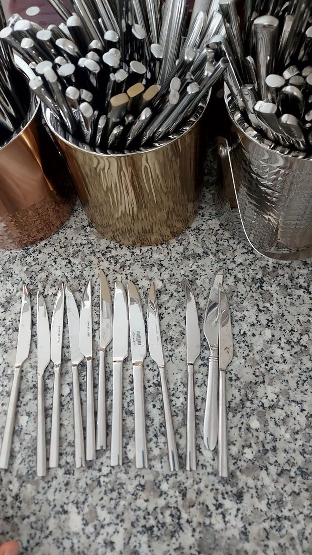 Mutfakta çeşitli kesim ihtiyaçları için uygun, şık saplı gri paslanmaz çelik bıçak seti.