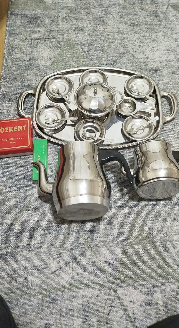 Gri paslanmaz çelikten yapılmış, tepsi ve bardaklı Özkent marka çay seti. Dayanıklı ve şık tasarım.