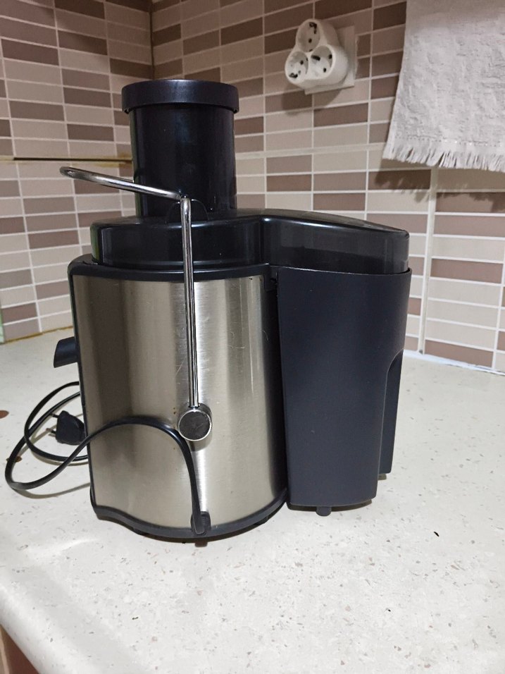 Gri renkli, paslanmaz çelik gövdesi ve geniş meyve besleme ağzı bulunan katı meyve sıkacağıdır. hediye gelmişti 2 veya 3 kez kullandım, fazlalık oldu,