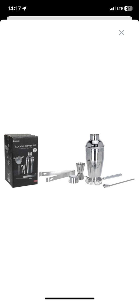 Gri paslanmaz çelikten yapılmış kokteyl shaker seti; shaker, süzgeç, jigger, maşa ve karıştırıcı kaşık içerir. Paketli hiç kullanılmadı