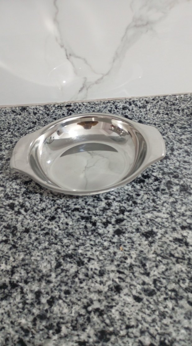 Gri renkte, kulplu ve desensiz paslanmaz çelik tabak, klasik tasarıma sahiptir ve kolay taşınabilir.