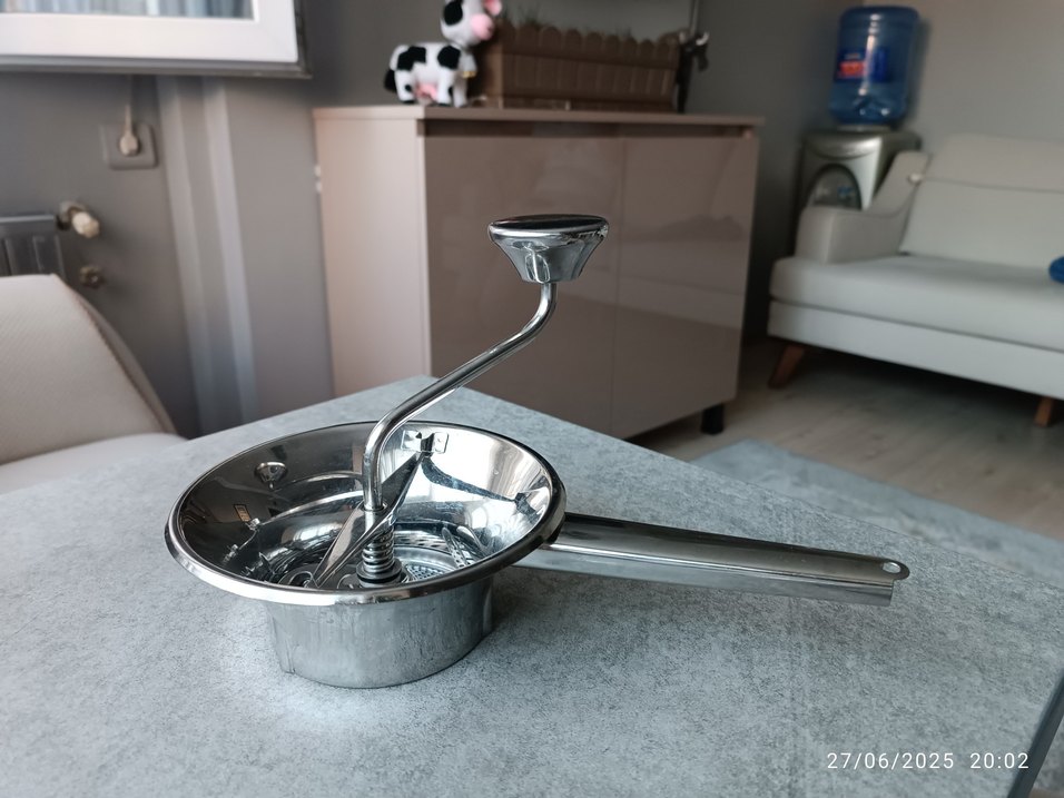 Paslanmaz çelikten yapılmış, kolay presleme için krank kollu mutfak aracı. Verimli yemek hazırlığı sağlar.