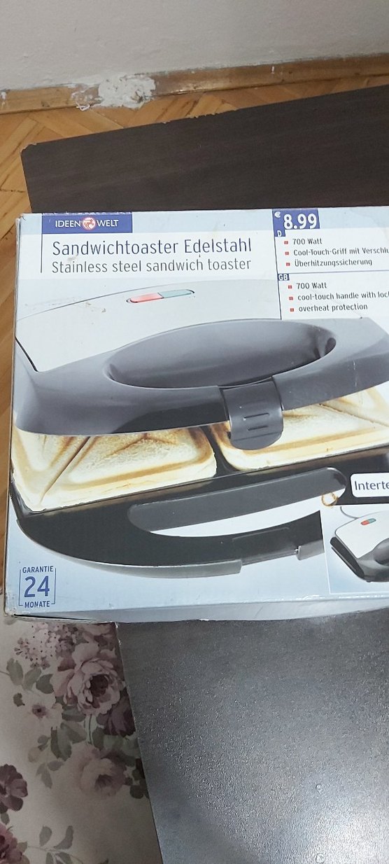 Gri paslanmaz çelik sandviç tost makinesi, 700 watt gücünde, soğuk tutuşlu kulp ve aşırı ısınma koruması ile güvenli kullanım sağlar.2 kere kullanılmış.Çizik olmayan bir üründür.