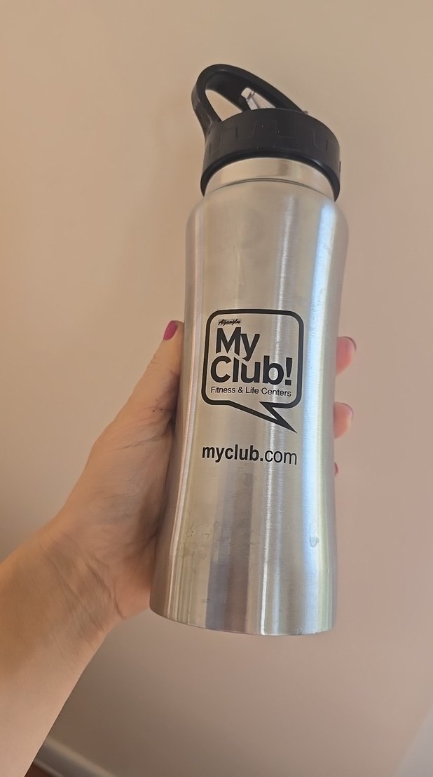Güvenli siyah kapaklı, saplı gri paslanmaz çelik su şişesi. Üzerinde 'My Club!' ve 'myclub.com' yazıları bulunur. Spor salonunda da kullanilabilir, ya da yolculukta ya da günlük.