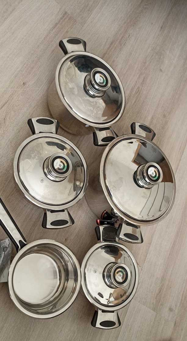 Gri paslanmaz çelikten yapılmış, kapaklı ve sağlam saplı farklı boylarda tencere seti. 9parça hiç kullanılmamış Almanya'dan gelmiştirEn büyük tencere 5.5litre bi küçüğü 3.0litre bir küçüğü1.5litre bir küçüğü 1.0litre sosluk 1.0litre sadece bir kapağında beklemeye dayalı lekelenme oluşmuştur görselde mevcuttur