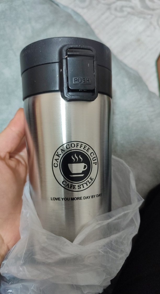 Gri paslanmaz çelikten yapılmış, kolay açılan push düğmeli termos bardak. Önünde kafe stili logosu bulunur. ☕