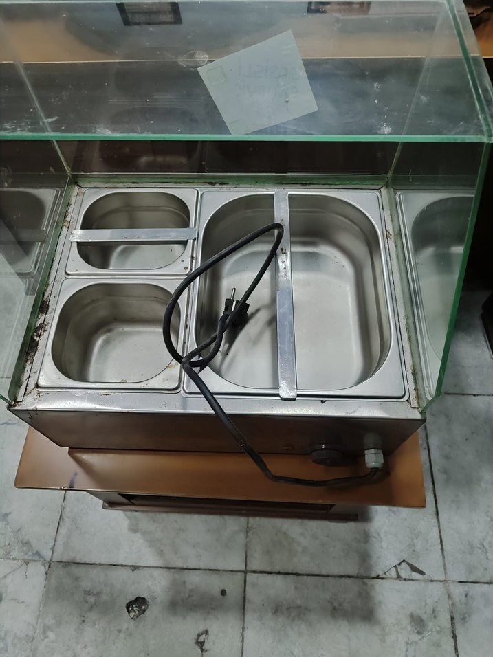 Gri paslanmaz çelikten yapılmış, birden fazla bölmeli ve yiyecekleri sıcak tutan cam kapaklı yemek ısıtıcı. Elektrik kablosu ile çalışır.
