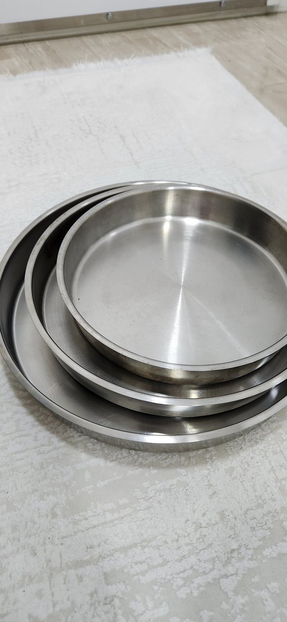 Farklı boylarda gri paslanmaz çelik yuvarlak tepsiler seti, servis veya mutfak kullanımı için uygundur. ️