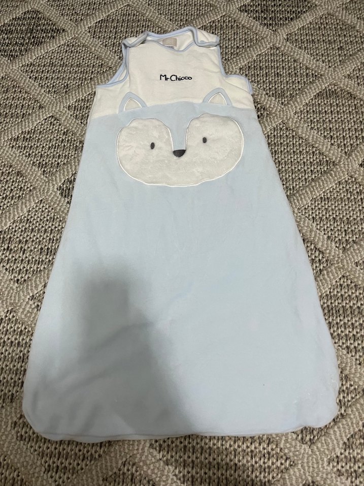 Yumuşak ve sıcak kumaştan yapılmış, gri pastel renkli ve sevimli hayvan desenli çocuk uyku tulumu.