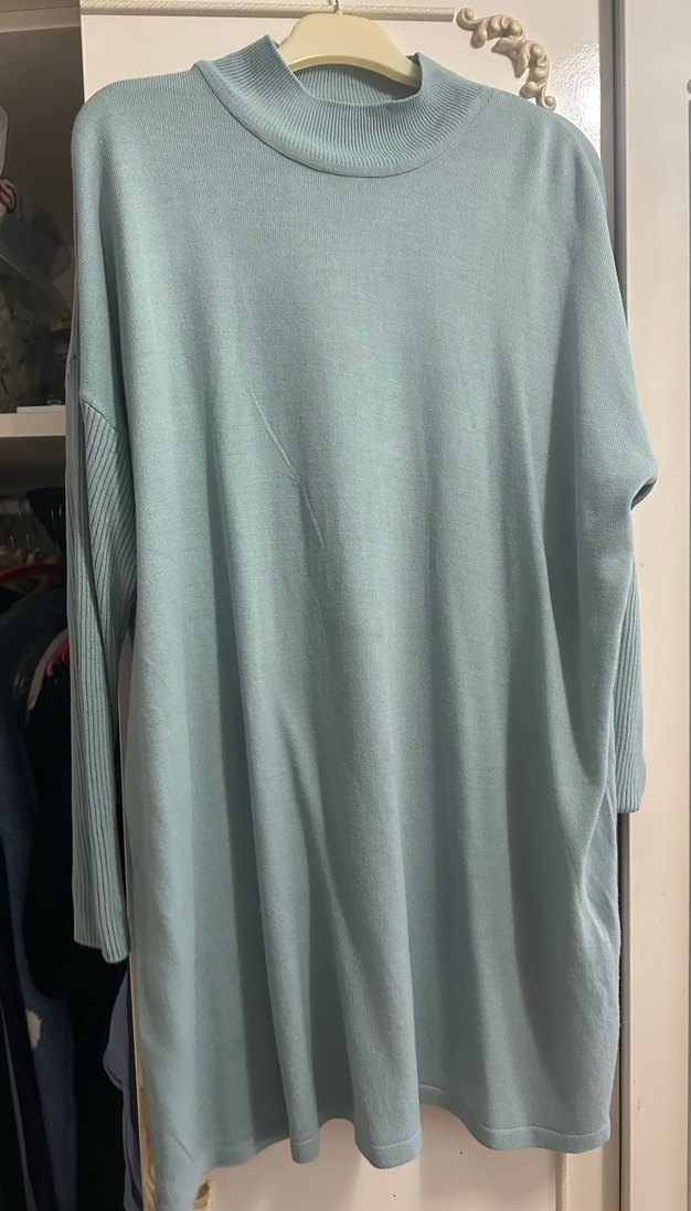 Yüksek yakalı, uzun kollu ve salaş kesimli gri pastel kadın kazak. Yumuşak sentetik kumaştan, rahat ve gündelik stil için uygun. #tunik#kazaktunik