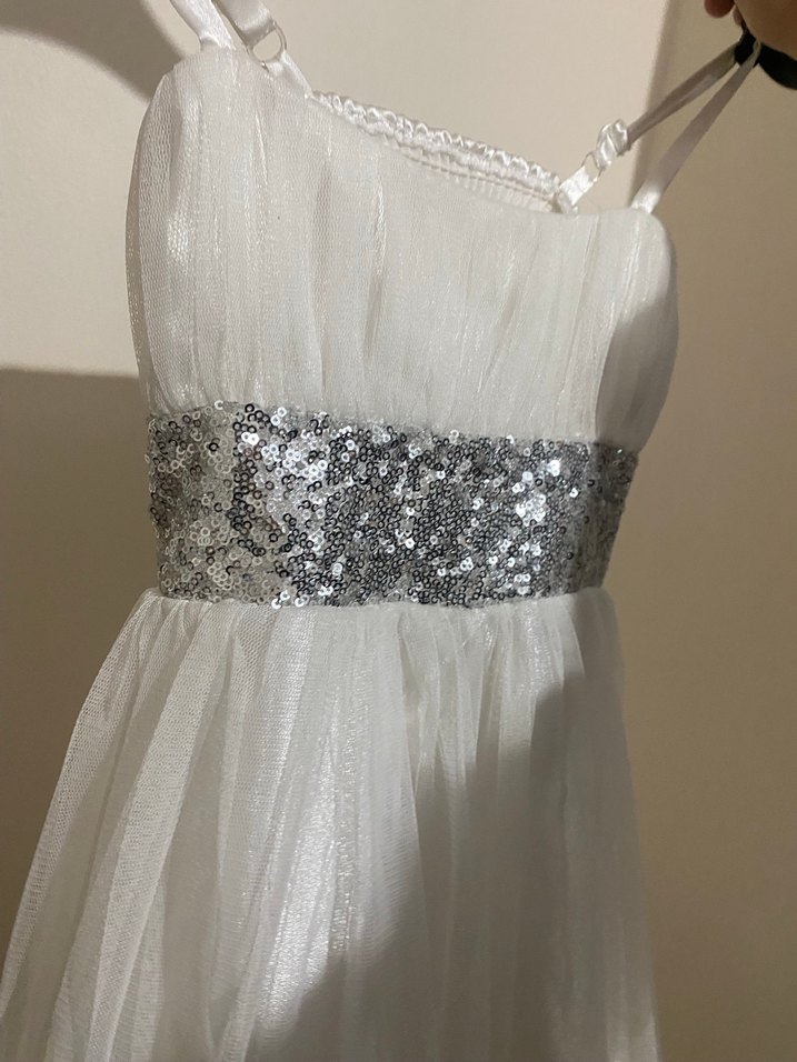 Beyaz mini gelinlik, askılı kollar ve straplez yaka ile fitted kesime sahiptir. Gri payet detaylı beli, modern klasik tarzı ve uzun boyu ile göz alıcıdır.
