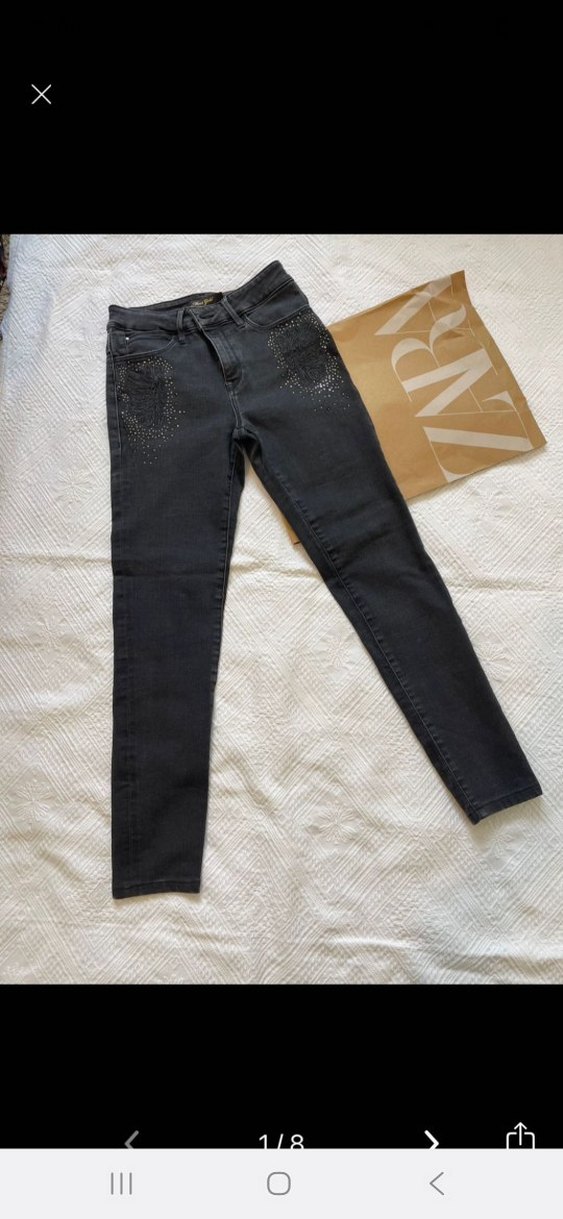 Gri denim pantolon, regular fit ve midi boyda, payetli baskılı detaylara sahip. Günlük rahat kullanım için uygundur. ürün kullanıldı taşlarından düşen var fiyatına yansıttım.