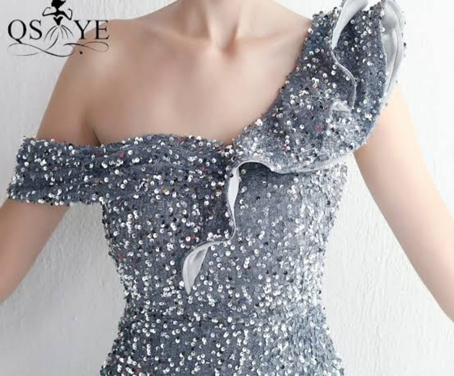 V yaka, kolsuz, vücuda oturan gri abiye elbise, payet işlemeleri ve fırfır detaylarıyla parti için şık bir seçenek. L beden Asya ölçülerinde s/m beden uyumlu✨