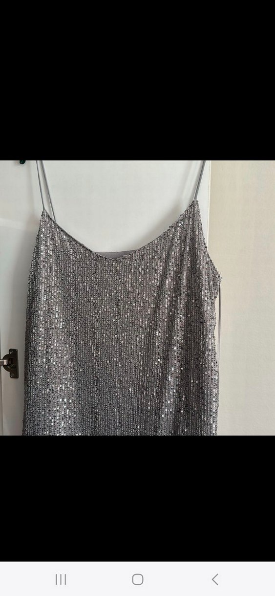 Gri renkte, payetlerle kaplı, kısa kolsuz bu abiye elbise, tekne yaka ve vücuda oturan kesime sahiptir. Parti için uygundur. ✨