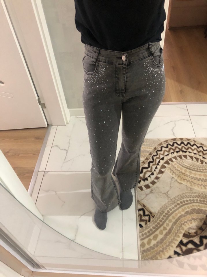 Gri kot pantolon, bol kesim ve midi boyda, payet detaylarıyla sokak stiline uygun rahat bir modeldir.parıltılı o yüzden satıyorum hiç giymedim bedeni 38 ama dar kalıp 1.72 boyundayım bir tık kısa boylularda daha güzel durur
