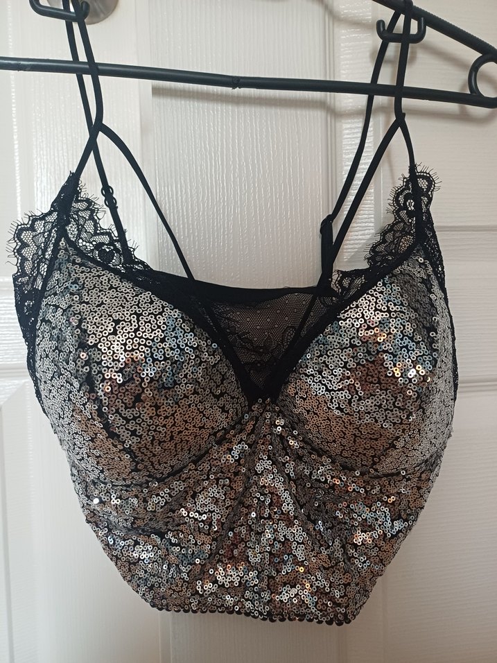 Dantel detaylı, strappy askılı ve straplez yakalı gri payetli, fitted büstiyer. Yılan desenli, partiler için uygun şık bir parça. ✨
