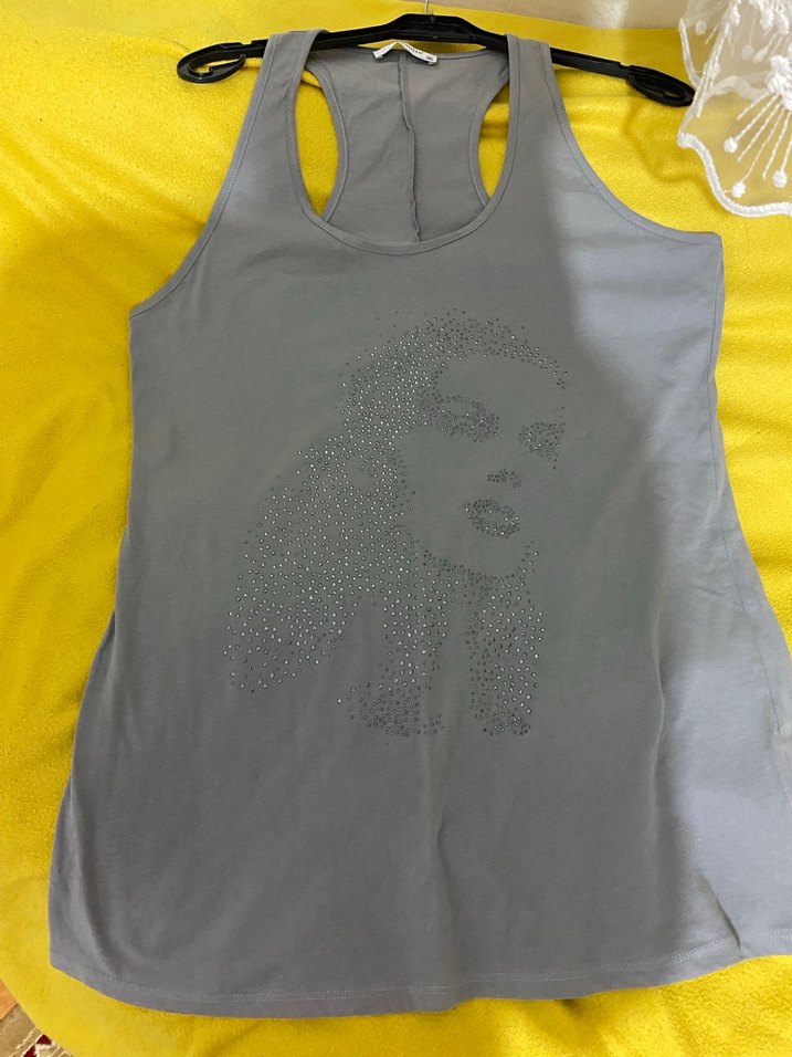 Gri renkli, yuvarlak yakalı ve kolsuz kadın atlet. Sentetik kumaştan, loose kesim, payetli baskı detayıyla günlük kullanıma uygundur.