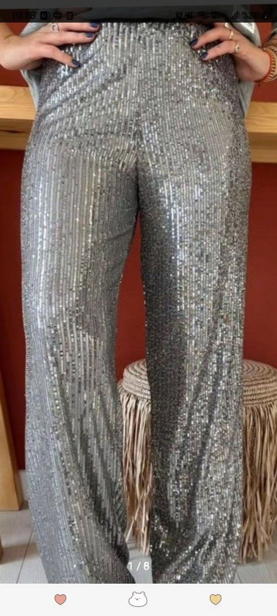 Uzun gri payet işlemeli, bol paça kadın pantolon. Sentetik kumaştan, rahat kesim ve çağdaş tarzda, parti için uygun. ✨