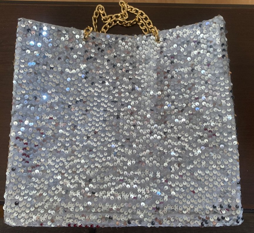 Gri payet pullu kadın çanta. Altın zincir askısı ile dikkat çeker.