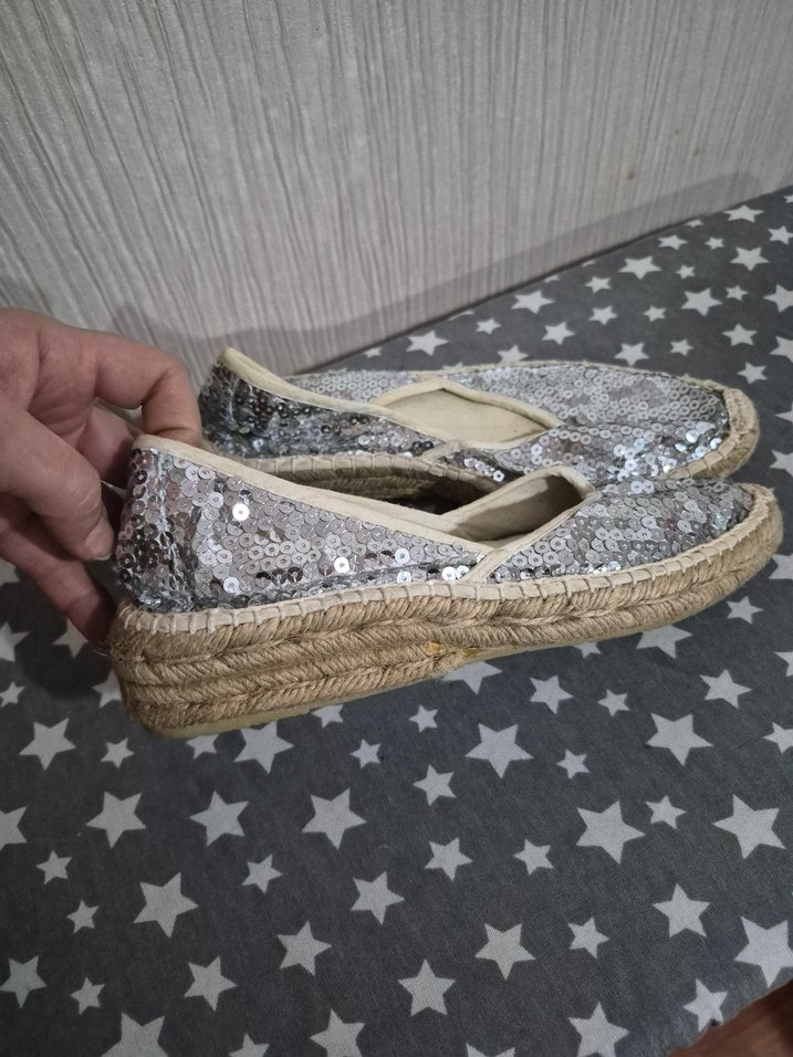 Gri payetli ve nakış detaylı, sentetik kumaştan yapılmış dolgu topuklu espadril, günlük kullanım için uygundur. ✨